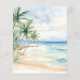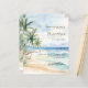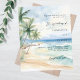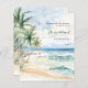 An elegant wedding invitation for a beach wedding, destination wedding. A watercolored sandy beach, ocean waves and palm trees as background.