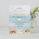Perfect for tropical destination weddings or any summer beach and coastal themed wedding, these elegant invitations feature a blue watercolor ocean background, with seashells on the beach at the bottom, and REAL GOLD FOIL for text accents.