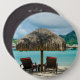 Button with a thatched parasol and two sunlounger chairs on a white sand beach in a luxury overwater bungalow resort in the clear blue lagoon of the pacific island of Bora Bora, near Tahiti in French Polynesia.