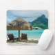 Mousepad with a thatched parasol and two sunlounger chairs on a white sand beach in a luxury overwater bungalow resort in the clear blue lagoon of the pacific island of Bora Bora, near Tahiti in French Polynesia.
