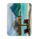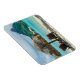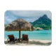 Rectangular souvenir magnet of a thatched parasol and two sunlounger chairs on a white sand beach in a luxury overwater bungalow resort in the clear blue lagoon of the pacific island of Bora Bora, near Tahiti in French Polynesia.