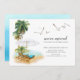 Modern watercolor beach scene with two beach chairs, white umbrella, palm trees & seagulls coastal moving announcement.