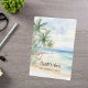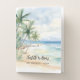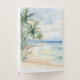 A watercolored image with a sandy beach, ocean waves and palm trees. Personalize and add your name and a title.