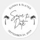 Beach inspired save the date stickers feature your names and wedding date with "Save the Date" in the center in modern handwriting script, accented by palm trees. Perfect for beach, tropical and destination themes.