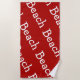Fun simple beach theme towels in a typographic pattern that says the word Beach in casual letter pattern