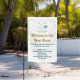 A cute beach real estate company open house garden flag sign for a realty business located in a coastal town or tropical island city. The realtor name is written in blue script under the seaside house and palm tree with sun. Great marketing item for a home builder off of the coast.