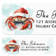 A watercolor red crab wearing a classic red and white Santa hat with a light blue watercolor stain background. Perfect for sticking on your holiday mailings.