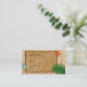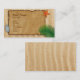 A Summer Business Card with text on a parchment, decorated with a palm leaf, a stone and a starfish on beach sand background.