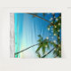 This fun tropical beach destination tapestry can be used in your bedroom, living room, college dorm room, or office, or for a photo booth backdrop and features a tropical beach, turquoise blue ocean, boats, elegant palm trees, and string lights. This backdrop perfect for your tropical beach birthday party or other celebration. Photograph of beach and palm trees taken on the Big Island of Hawaii and design © by TK Goforth.