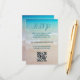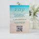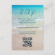 Vertical wedding enclosure card with a beach scene and QR code template. Use to have guests reply to your wedding invitation easily, online. This card has two ways to reply, just in case guests prefer one over the other. Tropical blue ocean water and beach sand is the background for sea blue text. The website is in black. Replace the QR code with your own.