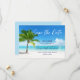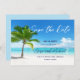 This beach theme save the date card features a breathtaking beach scene with crystal clear water, fine white sand, and a beautiful palm tree. The intense blue sky and scattered clouds add an perfect summer view. This design is perfect for a destination wedding, summer wedding, or beach wedding.
