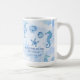 "Beach Seahorse Starfish Sea Shells Welcome Family Name Coffee Mug." Art created by internationally renowned artist and designer, Audrey Jeanne Roberts. Modern, loose painterly watercolor wash with blue tones from aqua to periwinkle mixed with fun, hand drawn floral and geometric patterns that fill the seahorses, starfish, sand dollar and scallop shells. Elegant stylish home decor or gift wrap design. Copyright.