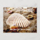 super close up of sea shells on the beach with customizable text for personalization of general greetings or suitable as wedding, engagement, rsvp, save the date, travel, invitation postcard