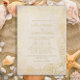 Elegant sand-colored beachside wedding ceremony gold-foil invitation framed with gorgeous seashells.