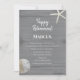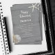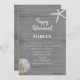 Retirement party invitation for a man or woman with sand dollar and starfish design. Medium gray wood grain background stationery has white text templates. A white sea star and sand dollar decorate the corners and text is in bold handwritten script at the top with “Happy retirement” text. Then a place for his or her name printed in bold lettering. Beneath is a paragraph for all celebration text including RSVP.