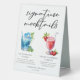This chic beach signature mocktails table tent sign features simple black typography above 2 seaside drinks and their ingredients for your coastal party. A cute Blue Hawaiian sunrise drink and non-alcoholic Strawberry Daiquiri drawing add a cool flair to your bar menu. Complete with the couple's names and date for their reception.