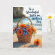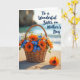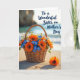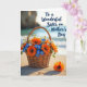 Designed with a rustic woven basket as the main focus, the scene shows it resting on sunlit, finely textured sand and overflowing with fresh flowers. Orange daisy-like blooms with deep centers mingle with small sky-blue clusters and crisp white florets, creating a look that feels like a gentle gift shared between close family ❤️. In the foreground, one orange flower lies alone on the sand, as if set down with quiet care. Behind it all, the beach fades into a soft blur where calm blue waves meet a hazy horizon and faint shapes of distant land. Warm golden light stretches long shadows across the sand, adding depth and a tender, unhurried mood. In the upper right, dark blue lettering reads “To a Wonderful Sister on Mother’s Day,” standing out clearly against the pale sky tones 🌼. The basket’s woven texture is detailed and earthy, with the brightest orange petals catching the light near the top edge.