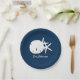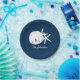 Perfect for beach theme family parties, weddings, birthdays, retirements and other events, these personalized coastal paper plates feature a white sand dollar and 2 starfish on a navy blue background. Find matching paper cups, napkins, and coasters in the collection.