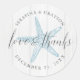 Round beach wedding favor label sticker for a rustic beach wedding with a vintage starfish illustration and classic traditional serif font and elegant calligraphy handwriting "love and thanks" with names and wedding date. Click CUSTOMIZE FURTHER to change the colors or fonts to coordinate with your event.