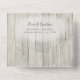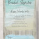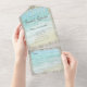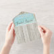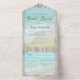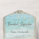 This all-in-one bridal shower invitation includes the invitation plus a tearaway recipe card at the bottom, and can be folded and mailed so you don’t need an envelope. Framed with a background of rustic weathered gray wood, beautiful aqua blue ocean waves crash against the beach and string lights decorate the top. These bridal shower invitations are perfect for destination weddings, as well as any beach and coastal themed wedding.