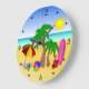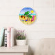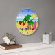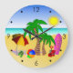 At The Beach © Sunny Mars Designs. This cute, colorful cool large round beach wall clock features a fun vector illustration of a beach scene with beach items including a beach umbrella, a beach ball, flip flops, a bucket and spade, palm trees, a beach towel and a surfboard. Makes a perfect gift for beach lovers.