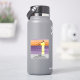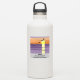 Stylized sunset with flying seabirds sits above a customizable gray bottom featuring a icons for Facebook, Tik Tok and Instagram. Beneath, a text placeholder for you event hashtag and social handle. Designed as a 3”x3” square label as event giveaway.