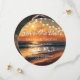 Beautiful sunset on the beach in the background. Lights strung above the ocean. Customize with all your upcoming wedding's information.