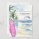 An invitation for a retirement party, for both men and women. A watercolored sandy beach, ocean waves and palm trees as background, and a blue and a pink surfboard on the beach.