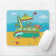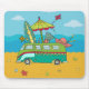 A colorful fun beach scene with a van, surfboard, beach um fella, scuba gear and beach hat.