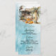 Beach Thanksgiving menu with a basket of pumpkins and flowers at the beach with palm trees and a surfboard.