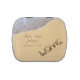 Lovely wedding favor candy tin, with a photo of a sandy beach, with LOVE written in the sand, decorating the lid. Dark sand colored text is ready to personalize for your wedding. Chose the candy flavor you prefer as filling. Perfect favor for beach and tropical themed weddings.