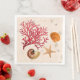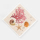 Sand and seashells paper napkins for your beach theme party. Decorated with red fan coral, nautilus, starfish, and orange scallop seashell. Matching paper plates or other styles of napkins are also available.