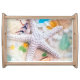 Beautiful beach theme graphic background serving trays designed with an artsy graphic design starfish, seashells, and sea glass in the image with designer tropical colors. Designed for a beach house and anyone who wants to add a touch of the tropics to their home decor.