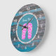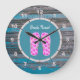 This unique beachy wall clock features pink flip flops adorned with darker pink hearts on a distressed teal blue and grey boardwalk background. A solid darker blue teal center is the focal point for the surrounding clock numbers so this wall clock incorporates practicality as well as design! The phrase "Beach Please!" can be easily personalized to say whatever you'd like. If you need help with further customization, please don't hesitate to contact the designer.