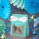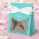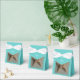 These beach themed wedding favor boxes feature a photograph of a starfish in the sand as a focal point with an imprint of a seashell. The photograph is surrounded with a beautiful aqua color and a lovely white ribbon is used to close the favor box with the words "Thank You" appearing right below the ribbon. This is a beautiful favor box for a beach themed wedding reception. Copyright htenishouseofpaper