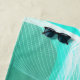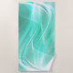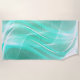 This beach towel is shown in a abstract art print of flowing lines in colors of seagreen and white.