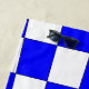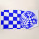 Checkered pattern in blue and white. Optical illusion of a rounded sphere distorts the squares to curve into a ball shape.