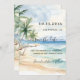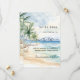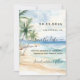 A watercolored sandy beach, ocean waves and palm trees as background. Personalize and add a date and your names. The text: Save the Date is written with a large trendy hand lettered style script.