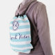 Bring nautical style wherever you go with this chic and breezy drawstring bag. The nautical design includes wide light blue and white stripes, “Beach Vibes” script in classic navy, and a custom monogram within porthole-style circles. Perfect for beach days, shopping and going to the gym, the relaxed yet elegant design combines fun and sophistication.