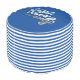 This decorative seasonal round pouf features "Beach vibes only" typography on a dark blue background. On the side is blue and white striped pattern. Great for summer vacation home or as coastal or nautical decor.