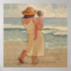 One of the most beautiful mornings at the beach -- this mother and baby are mesmerized by the sunrise over the ocean. We see the back of the mommy and the baby as they walk toward the ocean water. They are looking out over the horizon. There are beautiful white clouds over the horizon. The mother and baby gaze over the water. Are they thinking this will be a wonderful beach day? The mom is wearing a long white dress - a beach dress she wears over her swimsuit. She has dark hair covered by a wide-brimmed straw hat. Perfect attire for a wonderful day at the beach. The baby is wearing its all-together. The whole scene is the color of the beach - tans and blues. This is the perfect gift for the beachcomber in your life, and for the person who loves the ocean. It's a great image to celebrate your mother, and for mother's birthday or Mother's Day.