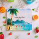 Beach Cutting Board with Watercolor beach art, blue green scenery, palm trees, mountains and flamingos. Use personalize this template to change text. More products with this design are in the collection below.
