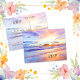 Beautiful watercolor of a beach sunrise with colorful rays of light in the sky that also reflect in the ocean waves. Lighter image on back with customizable text for the RSVP information.
