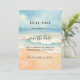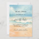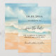A watercolored sandy beach, ocean waves and blue sky as background. Personalize and add a date and your names. The text: Save the Date is written with a large trendy hand lettered style script.