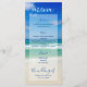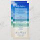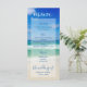 A beautiful ocean waves photo decorates this modern destination wedding dinner menu. Pretty blue cursive script over the tropical seaside photograph for your beach wedding reception. Add your appetizers, main course, and dessert over this coastal photography.