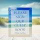 A beautiful ocean waves photo decorates this modern destination wedding guestbook foam board sign. Please sign our guest book is written in pretty blue script over the tropical seaside photograph. Perfect also for a beach house rental.
