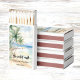 A tropical scenery. A sandy beach with waves and palm trees. Personalize and add your names and the wedding date. The text: The perfect match.