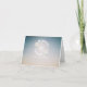 A notecard featuring an illustration of a beach themed wreath with illustrations of sand dollars and starfish over a photo taken at a beach of the sky at sunset. Personalize with your name and monogram.