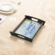 This is a well made, sturdy wooden tray with a flawless black finish and lovely map on the tray surface. It is both vintage & modern at the same time. Looks exactly like the photo; does not disappoint. So nice to find something of quality individually made and not the mass-produced 'shabby chic' merchandise seen in stores. I am so pleased to be able to give this to my college-age niece for her birthday. This can be used as a tray to hold jewelry or toiletries, or hung on the wall as art. The map surface is sealed (it is slightly shiny) so would be moisture resistant. It is well worth the asking price but I was able to apply a sale code as well. Very happy with my purchase. Map is crisp & clear and sealed with a water-resitant finish.