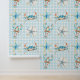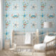 Coastal pastel blue, red and light green lobster, crab, sand dollar and starfish beachy tropical stick and peel wall paper. Light blue and white polka dot background.